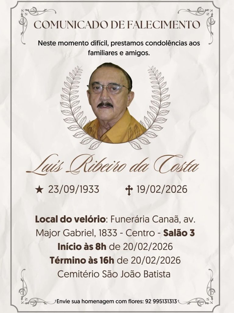O velório acontecerá na Funerária Canaã, nesta quinta-feira, 20 de fevereiro de 2026, a partir das 9h. O sepultamento está marcado para as 17h do mesmo dia, no Cemitério São João Batista.