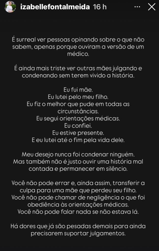 A primeira dama de Manaus, Izabelle Fontenelle Almeida, postou um desabafo ontem (19) em seus stories falando pela primeira vez sobre as circunstância médicas que envolveram a morte de seu filho, David Benedito, aos 20 dias de nascido. Ele disse que deveria ter seguido sua intuição de mãe, sem entrar em maiores detalhes, mas isentou de culpa a equipe médica que atendeu o bebê.
