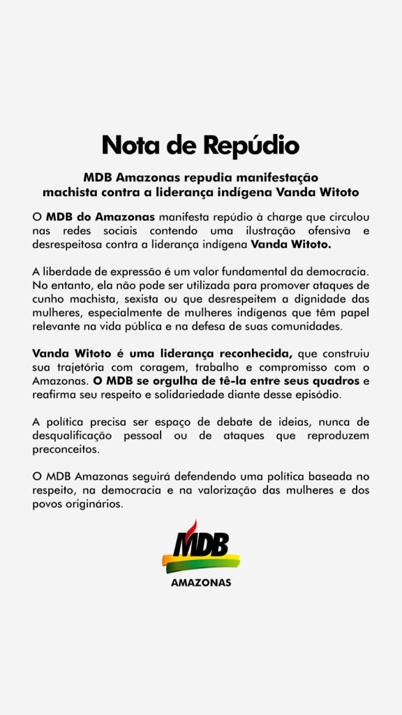 O senador Eduardo Braga (MDB) repudiou a violência política contra a mulher e manifestou solidariedade à liderança indígena Vanda Witoto, sua correligionária, que denunciou ataques misóginos nas redes sociais. Uma charge divulgada ontem a tratava de forma misógina e o autor, o artista Gilmal, assumiu o erro, revelando que a sugestão da publicação veio de integrantes do partido Rede, revoltados com a saída dela da legenda.
