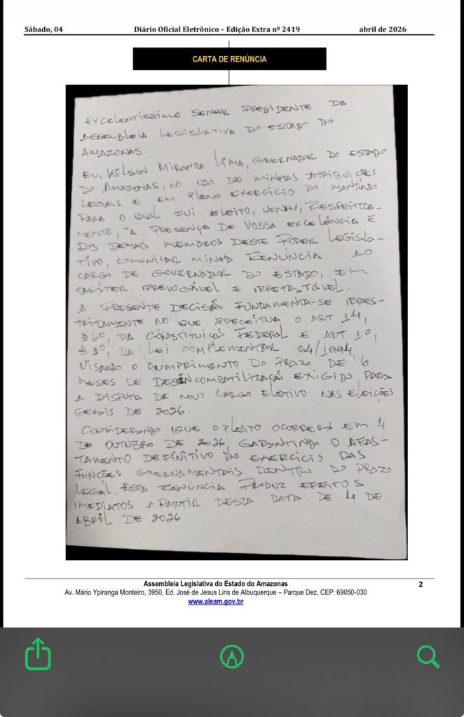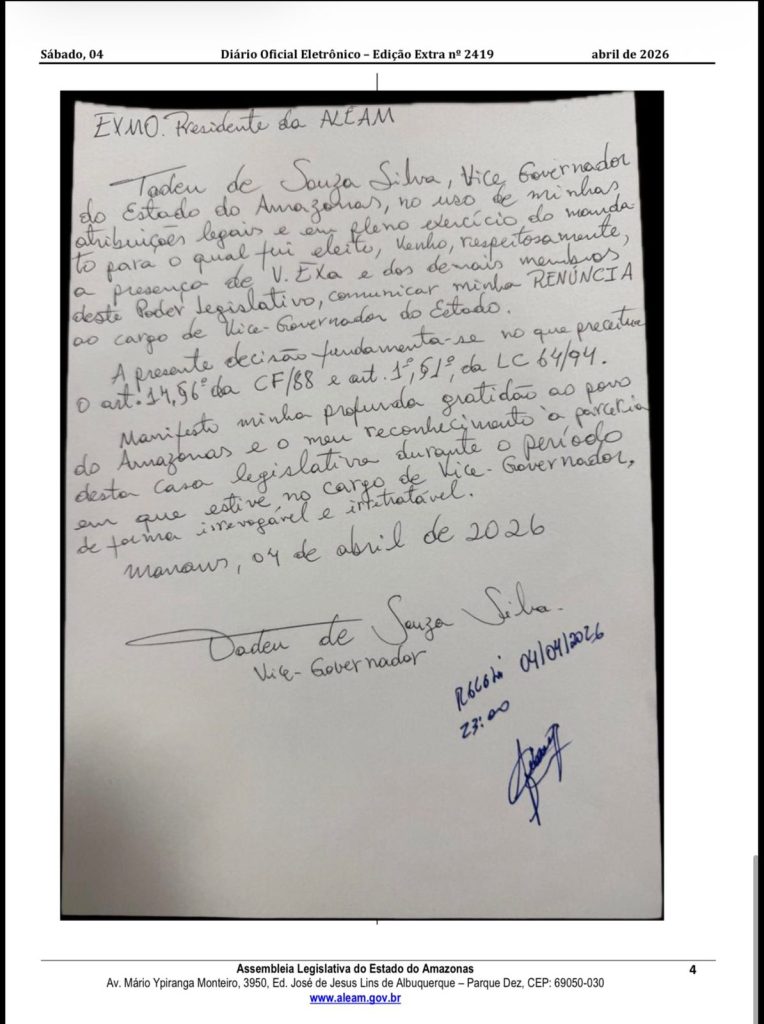 O inesperado aconteceu. Nem tanto a renúncia do governador Wilson Lima (União), que era especulada mesmo ele dizendo que continuaria no cargo. Mas sim a saída no mesmo ato do vice-governador Tadeu de Souza (Progressistas), que sempre disse querer ser candidato ao Governo sentado na cadeira de governador. Agora um novo personagem assume o protagonismo: o presidente da Assembleia Legislativa do Estado, Roberto Cidade (União) passa a comandar o Amazonas e deverá ser candidato a governador nesta condição. Seu vice, Adjuto Afonso (União), assume a Assembleia Legislativa.