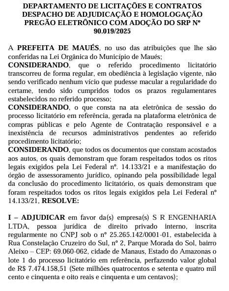 A Prefeitura de Maués homologou o resultado de um pregão eletrônico para contratação de serviços de manutenção predial no município. A vencedora foi a empresa S R Engenharia LTDA, sediada em Manaus, que vai receber o montante de R$ 7,4 milhões. As informações constam na edição dessa segunda-feira (8), do Diário Oficial dos Municípios.