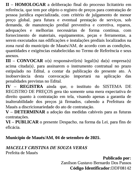 De acordo com o despacho publicado pela prefeita Macelly Cristina de Souza Veras, o contrato tem como objetivo o registro de preços para eventual prestação de serviços de manutenção preventiva e corretiva em prédios públicos de Maués, incluindo reformas, adequações e melhorias em instalações urbanas e rurais. Os trabalhos poderão abranger fornecimento de materiais, equipamentos, peças e ferramentas.